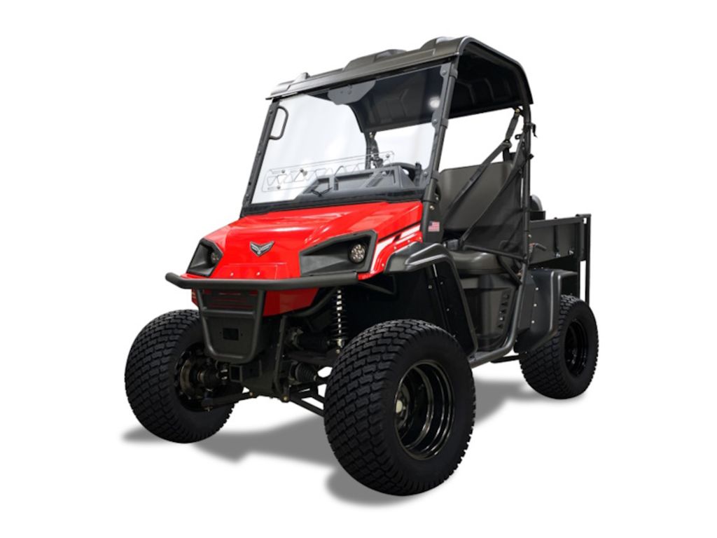 Features 3pt lap/shouder belts for driver and passenger, twin 12V auxiliary outlets for accesories. 12V/18W LED headlights, polyurethane powder paint, 2" rear receiver hitch, poly dump bed, bench seating, welded steel frame.